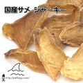 気仙沼(宮城県)または高知県で水揚げされた鮫を使いジャーキーにしました。肝油や軟膏で有名な鮫の有用性はご存じの通りです。ヒト用の食材であまり見かけないのは淡白すぎて旨味が少ないからかもしれません(見た目が怖いからかも…) 保存が難しいというのも一般的な食材になりにくい要因だそうです。
